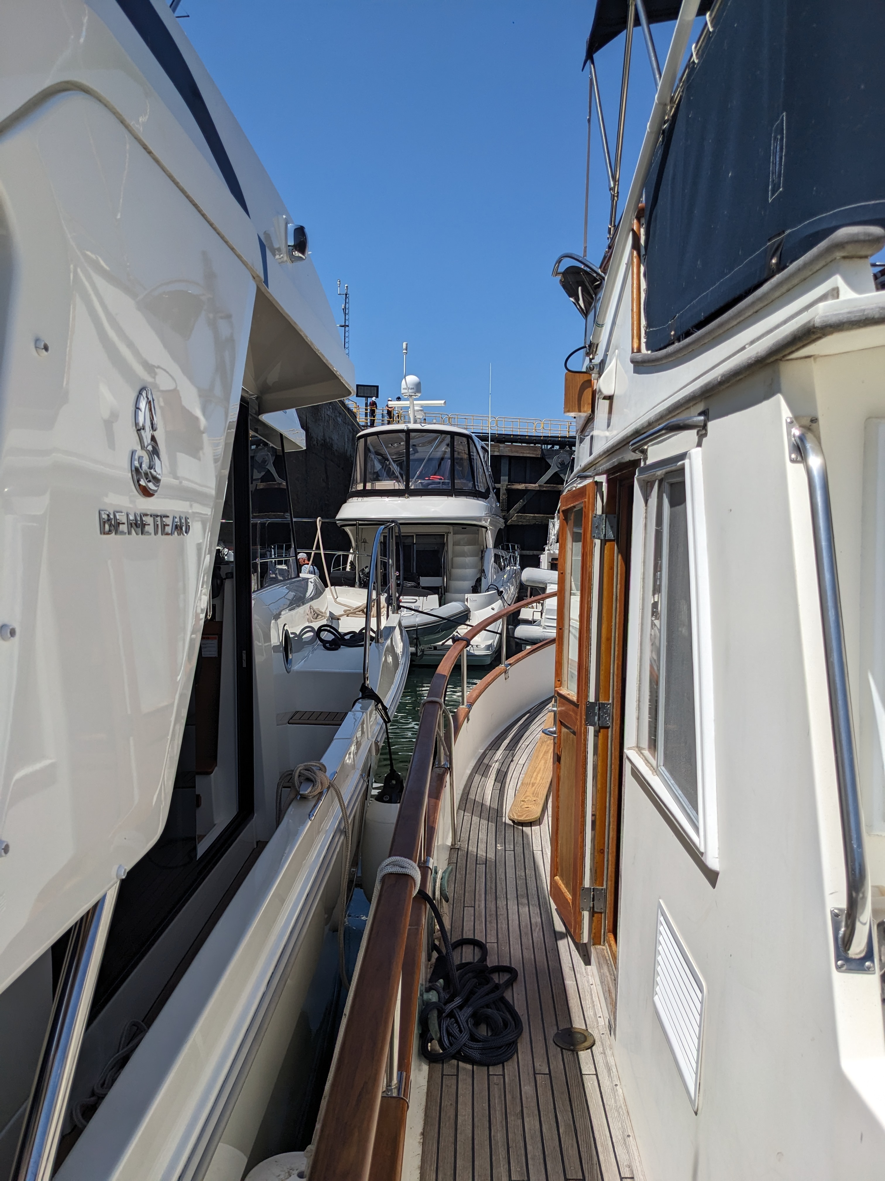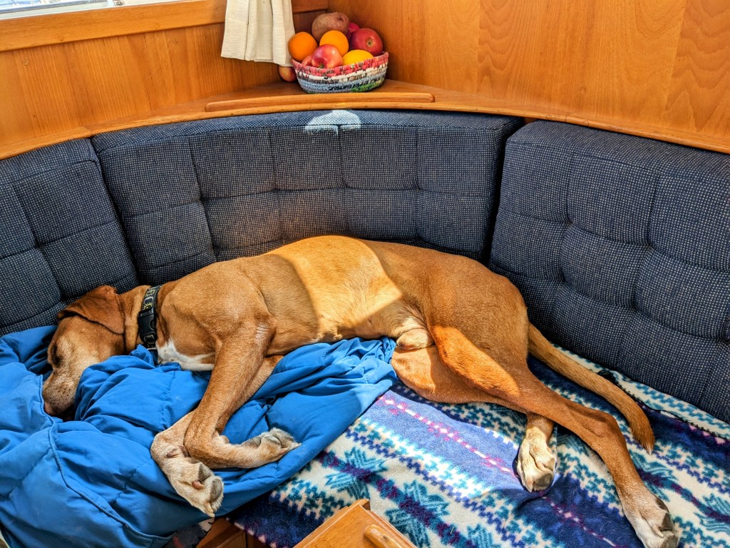 So after one night, we left for an anchorage that was much quieter and less bouncy (from passing boat wakes). While enjoying a late afternoon brew on the flybridge, we noticed our dinghy about 10 yds off the back of the boat, slowly drifting away. Ned ran to put his swim trunks on, but a sudden wind gust was moving it out fairly quickly. I kicked my sandals off, threw on a life jacket and dove in to retrieve it. It made for a fairly exciting cocktail hour! But we are so glad we noticed it, since it was headed out of the bay towards bigger water. We use it multiple times daily to get Zeke to shore when anchoring- which we planned to do a lot of in the coming weeks. Sorry, no photos of the heroic rescue–Ned was too amazed by my quick response 😳.