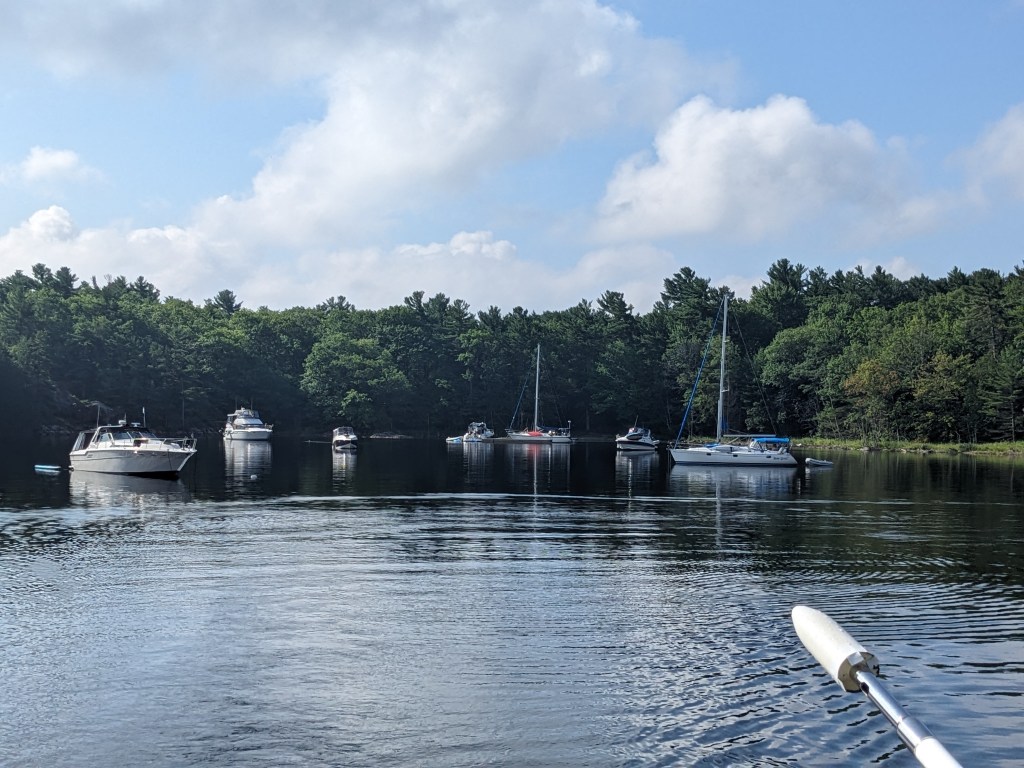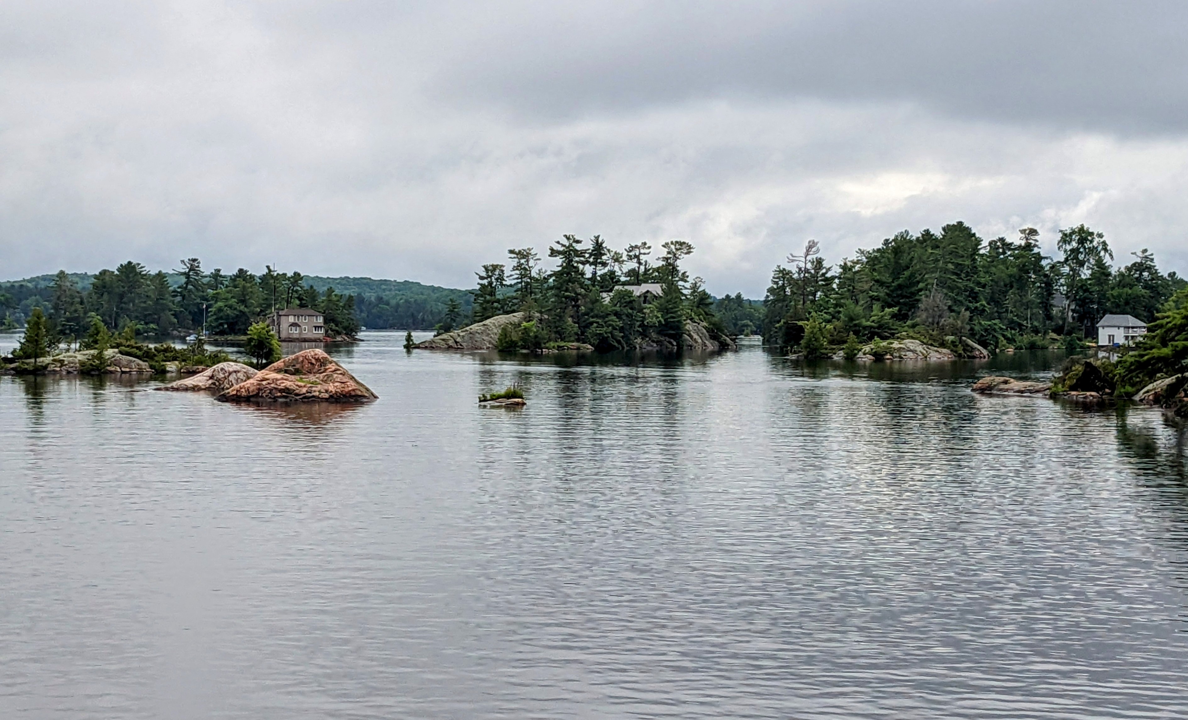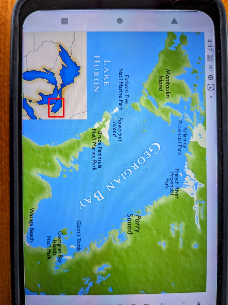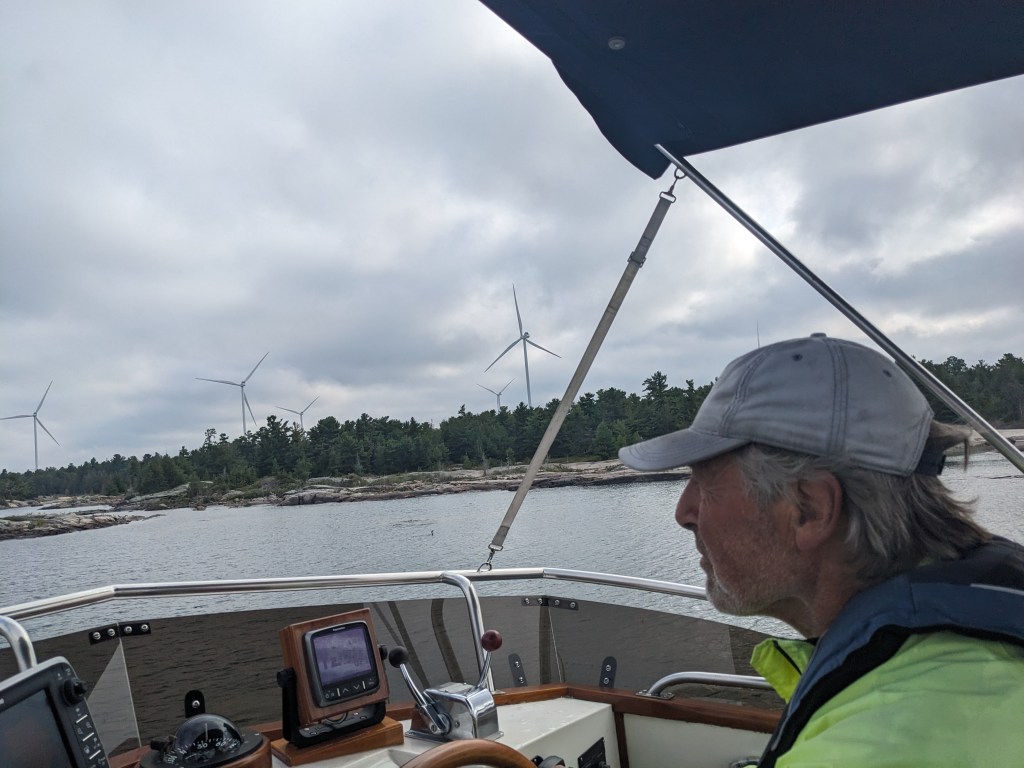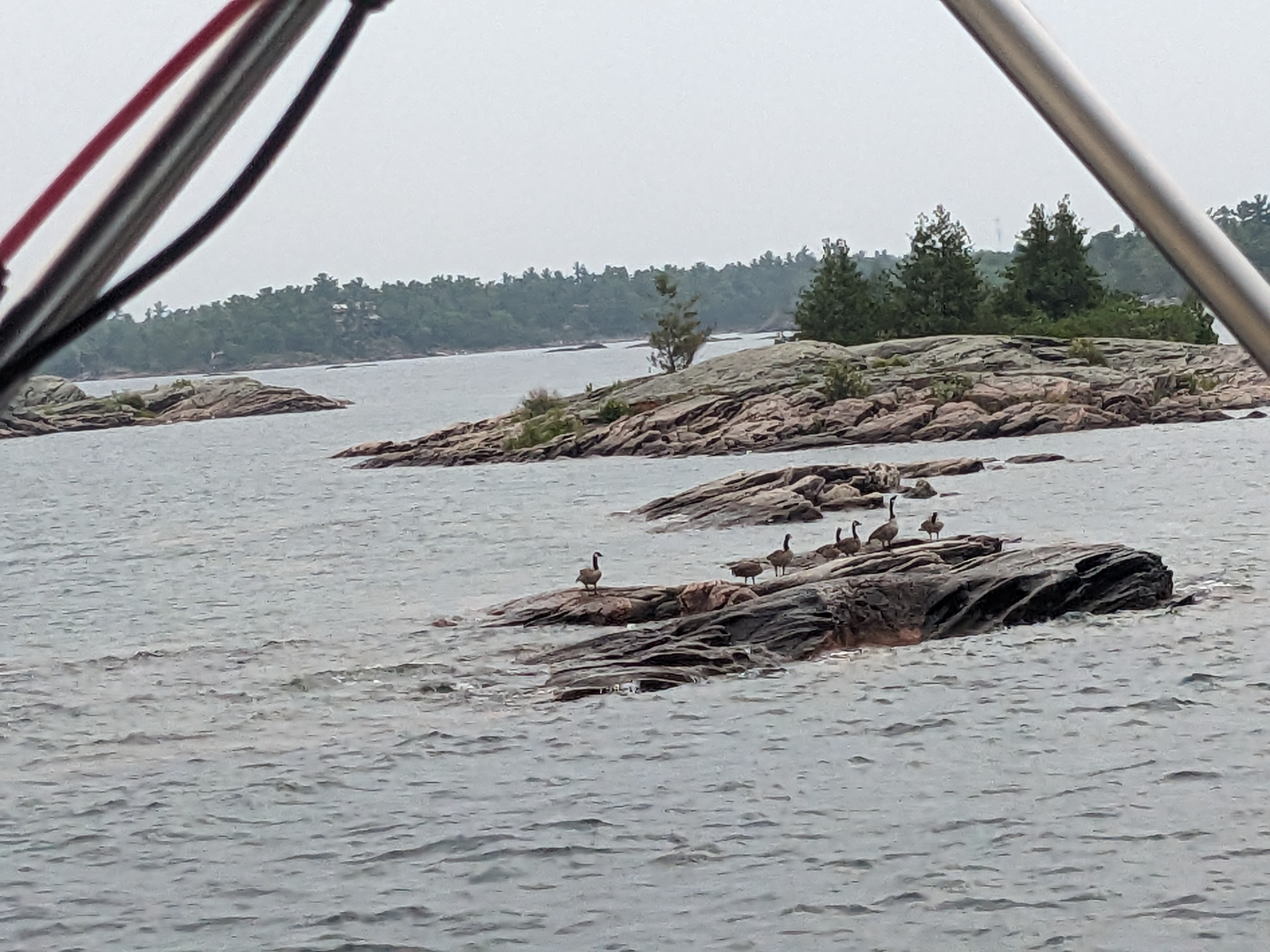 After another night of anchoring in an unnamed, but lovely bay, we headed for Wrights Marina in Byng Inlet where we ended up for 2 more days than we’d planned, due to high winds and thunderstorms. Although slightly anxious, we had to smile at a forecast for possible “Toonie” size hail, which, fortunately, did not materialize. On the third day, the sun emerged and we left the marina early to check out a possible anchorage in the Bustard Islands or push on from there across 18 miles of open water towards Beaverstone Bay and a more protected route to Killarney.