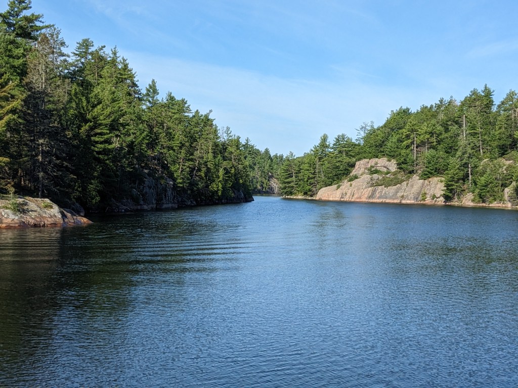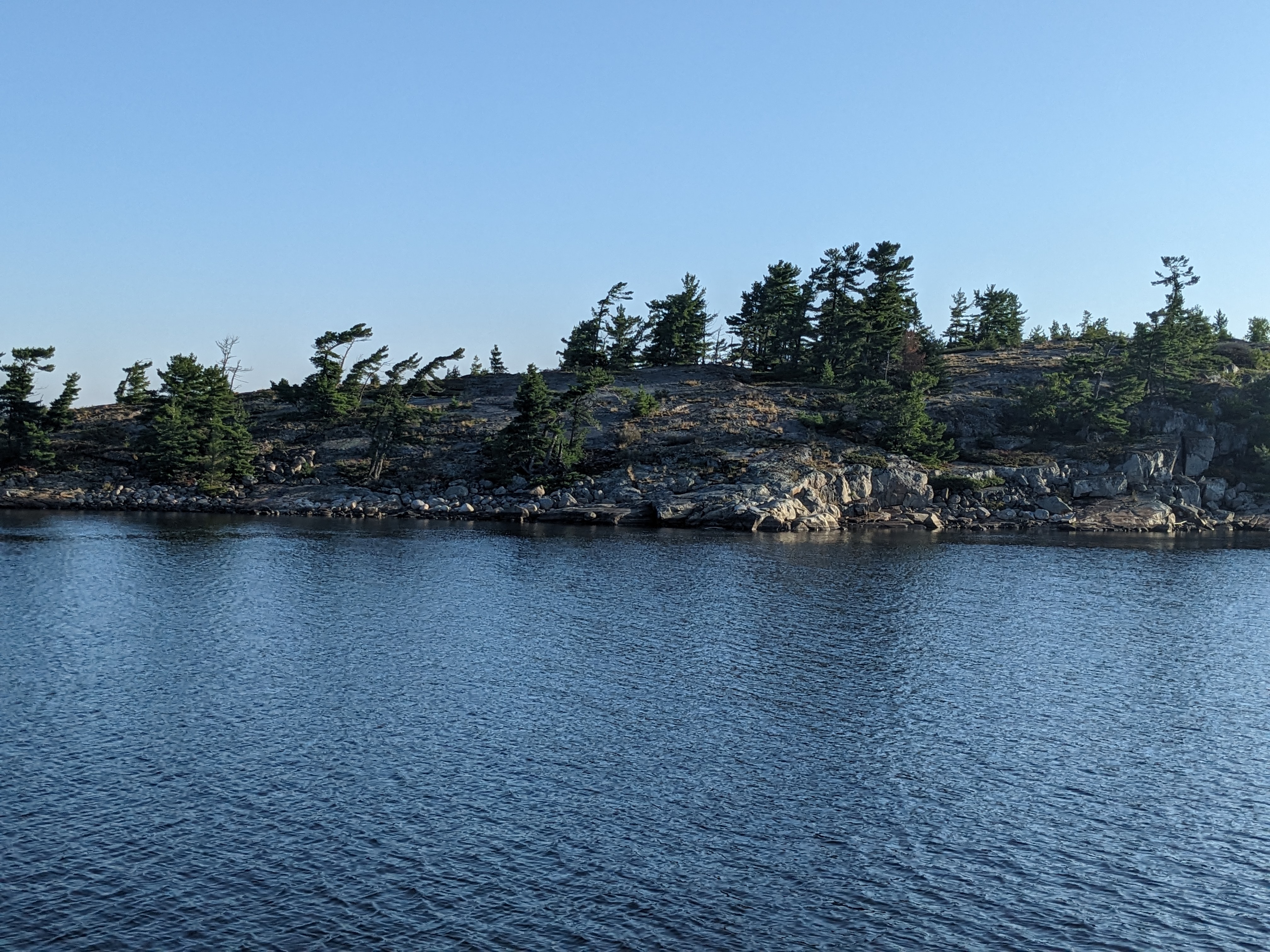 Long open water stretches can be challenging because Georgian Bay is very large and has a long fetch for north, west, and northwesterly winds, which are prevalent. These winds can create huge swells in open water, even at moderate wind speeds. So we were happy to just experience some long period, 2-ft waves as we left the Bustards and headed across to Beaverstone Bay. Turning in from the open water, we found another great overnight anchorage at Burnt Island and enjoyed the beautiful, high-walled, pink granite passage through Collins Inlet the next morning that led us nearly all the way to Killarney.