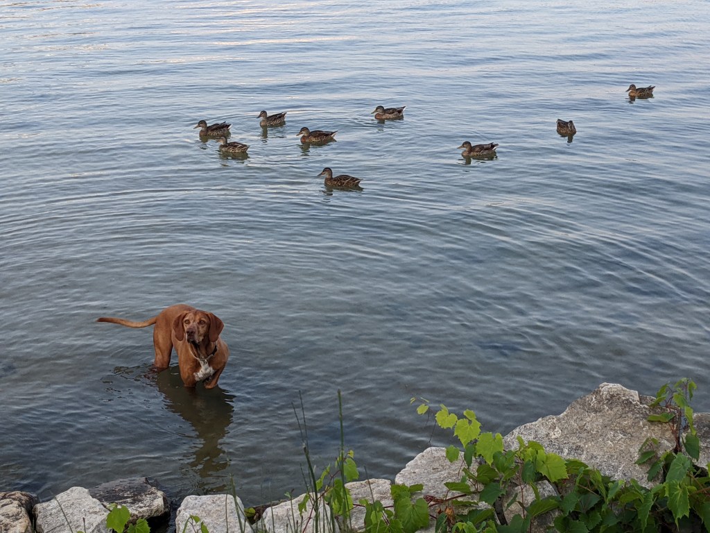 Beaver Island is a throwback in time with a few quaint shops, local bars (Beachcombers and Shamrock) and lots of local history, some involving a Mormon settlement on the island. It was pleasant enough, but much of the open shoreline near the marina was cordoned off from riffraff like us. But we did manage to find a hidden spot where Zeke could swim with the ducks!