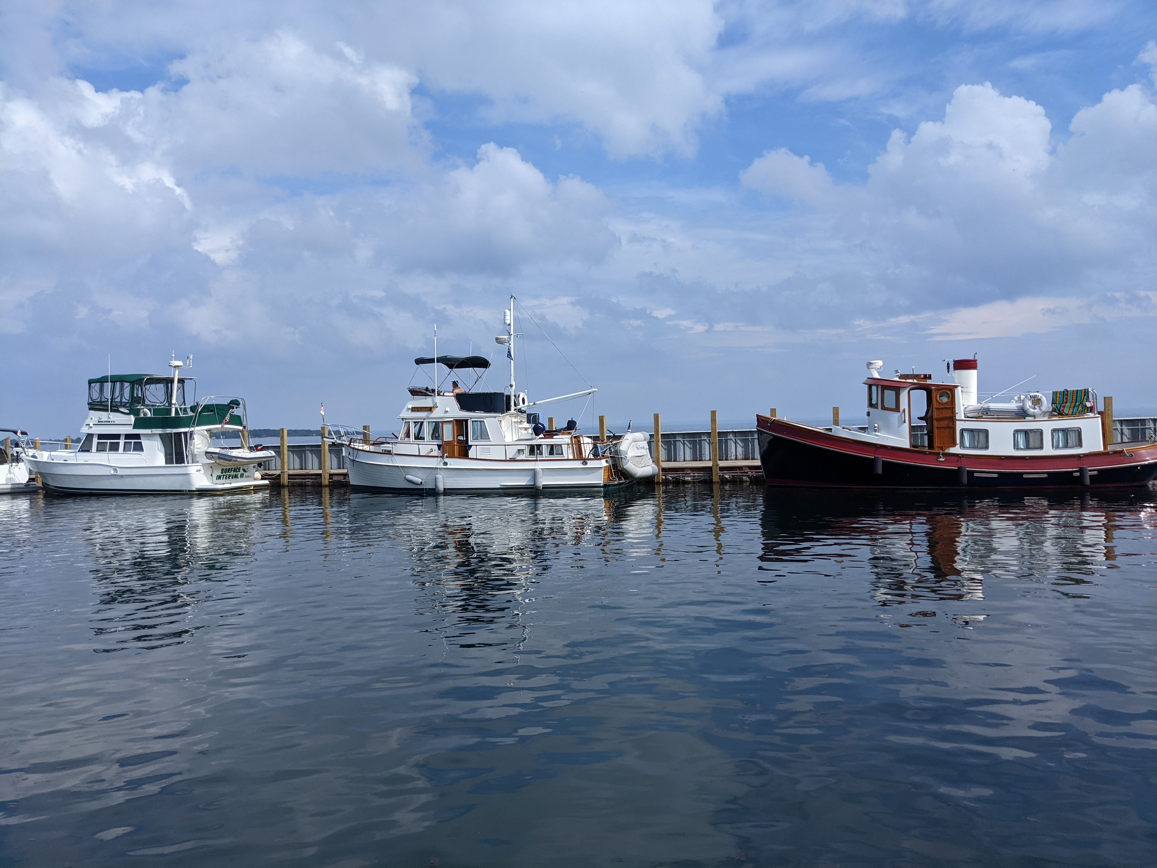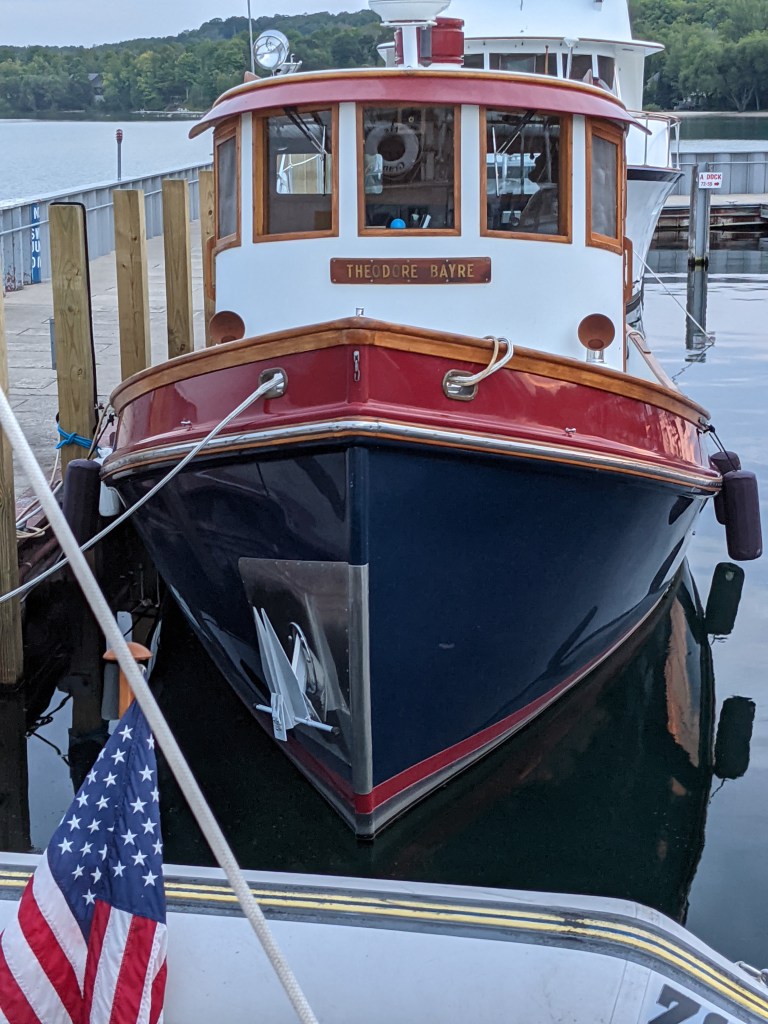 Northport, near the tip of the Leelanau Peninsula in Grand Traverse Bay was our next destination on Thursday, Aug 26. We thoroughly enjoyed the town and the marina, which was great as we were grounded for 4 nights due to weather. One storm was so intense it tore our flexible solar panels off our bimini. Luckily, the didn’t blow over the seawall and we were able to recover them with minimal damage! While there we met a number of loopers, several couples “practicing” for their 2022 loop, and we saw some interesting boats, including this tug docked behind us on the seawall!