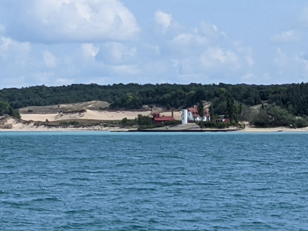 Started out early for Frankfort MI this morning (Aug 31) with north winds pushing us in a southeasterly direction past Sleeping Bear Dunes and North and South Manitou Islands. Would’ve loved to anchor out at S Manitou, but no pets are allowed on the islands. Passed Pt. Betsie lighthouse on the way into Frankfort and saw many monarchs migrating across the open water today. Found good food and beer at Stormcloud Brewing Co…. Nice logo too! We’ll wait here for favorable winds to cross the big lake to Wisconsin, maybe Thursday…