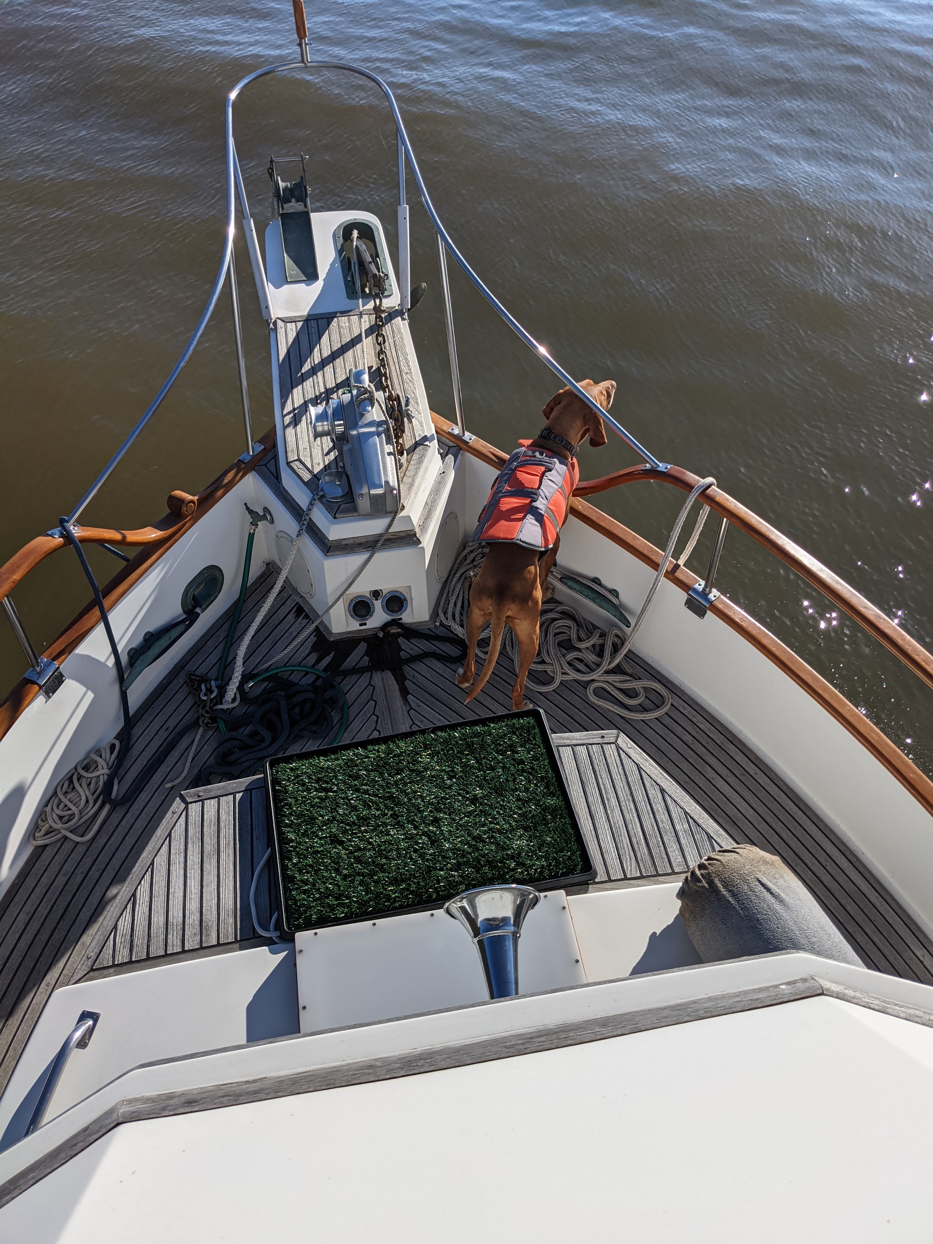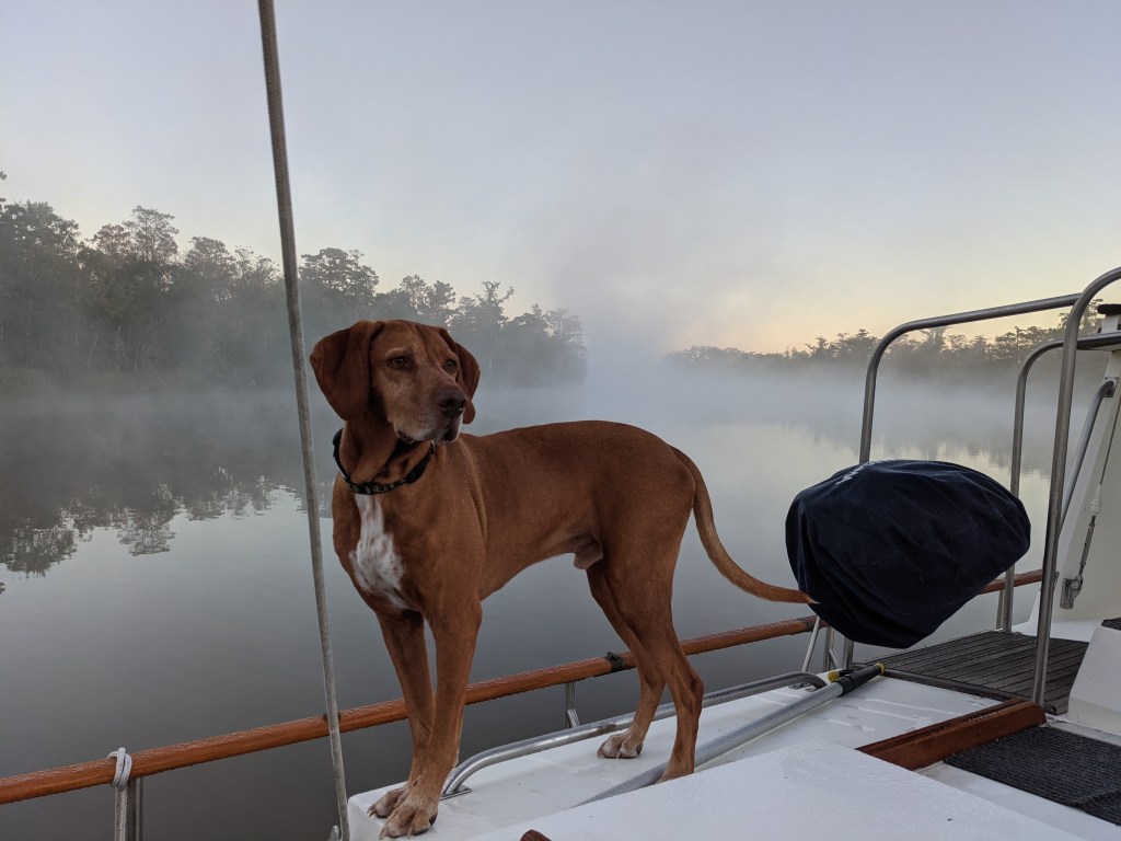 Zeke, our ever present companion, probably misses his daily runs in the Cable Woods or North End trails, but he is adapting to boat life too. He knows the anchoring out routine and pleads with us to lower the dinghy and head to shore once we’ve set the hook. He prefers river water over our clean water for drinking and has mastered the descent to the dinghy and reboarding the boat without knocking Ned or I in the water (so far). People in marinas and outdoor restaurants all love him and will remember his name and friendly manner long after they forget us! In fact, he made many new friends last nite when he broke out of the boat by opening the lever handle door and met us at the marina restaurant where we we were enjoying a patio dinner. Needless to say, he was invited to stay by the staff and received pets (for his naughtiness) by several other diners!