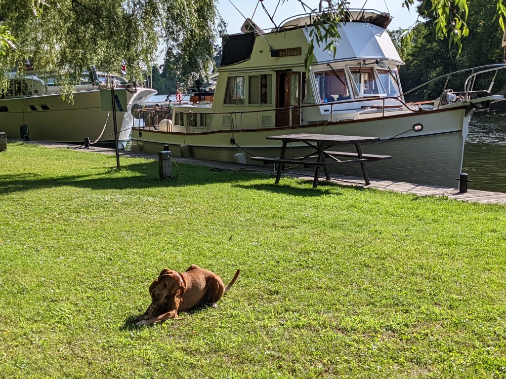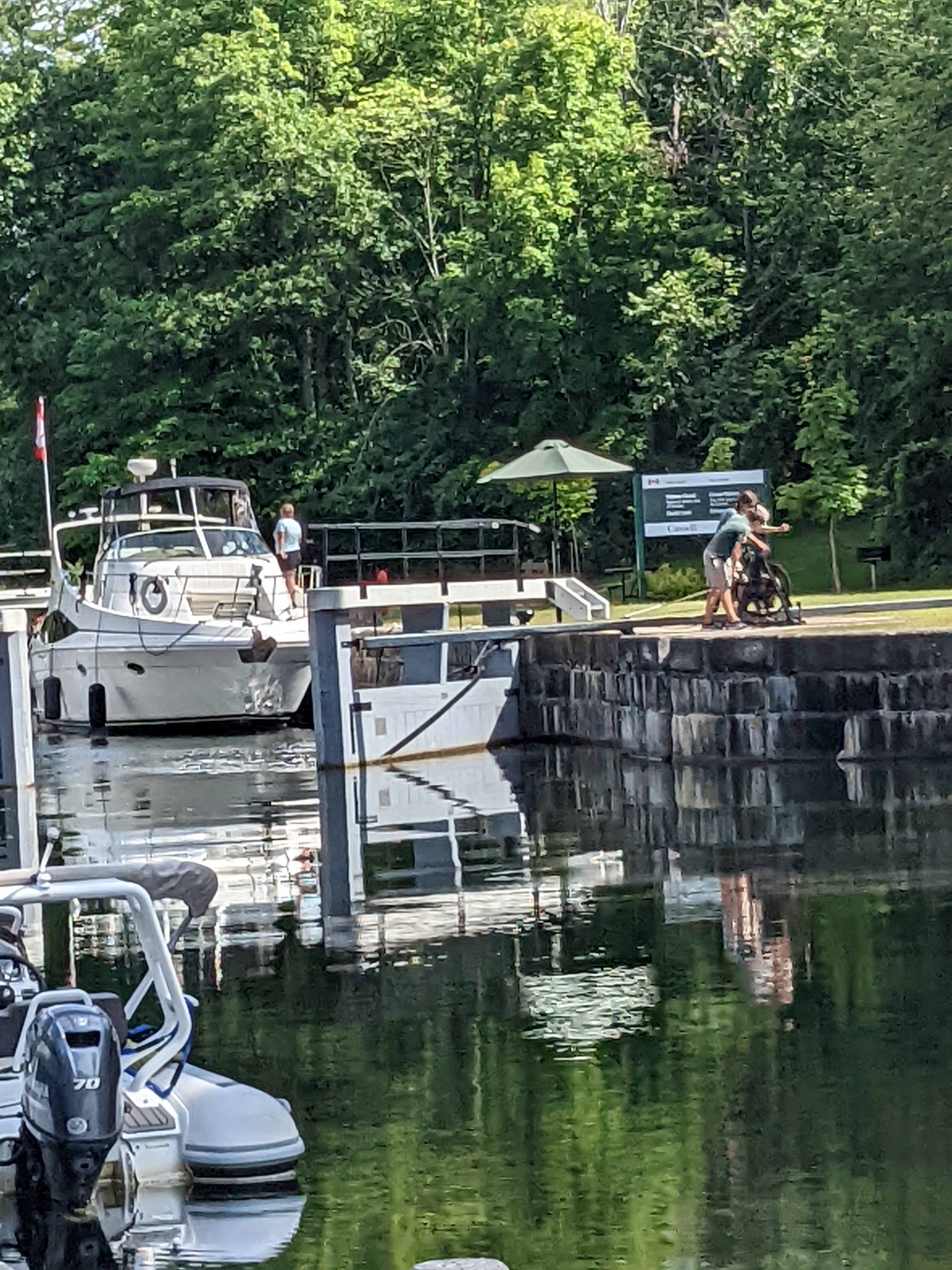 The Rideau Canal and other Canadian canals usually have mooring walls both above and below the locks where boats must tie up to wait for the lock keepers to tell you when and in which order boats should enter the lock (often multiple boats at once). This is very different than locks in the US where requests for passage and instructions from the lock keeper are all done via VHF radio. In Canada if you want to pass directly thru the lock you tie up on the part of the wall where there is a blue line. Once inside the lock you loop your boat’s lines around cables attached to the wall to stabilize it during the lifting or dropping process. If you just want to hang out or stay overnight, you tie up on the wall where there is no blue line. Many of the areas around the locks are park-like with picnic tables, bathroom facilities, and some even have 30 amp electric posts to plug into. We stayed “on the wall” at several locks and met some very nice people, including Doug who was traveling solo on his older 45′ Chris Craft trawler named “Y Knot Moor”. We enjoyed Doug and his dog Sadie”s company on our way north and south on the Rideau Canal.