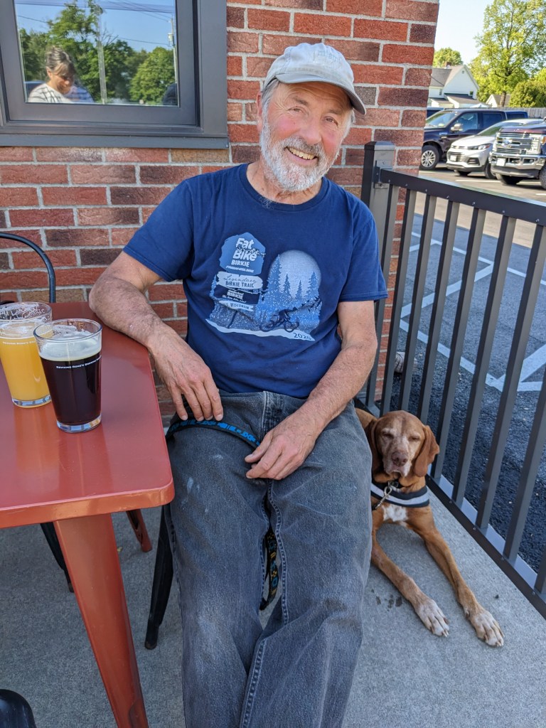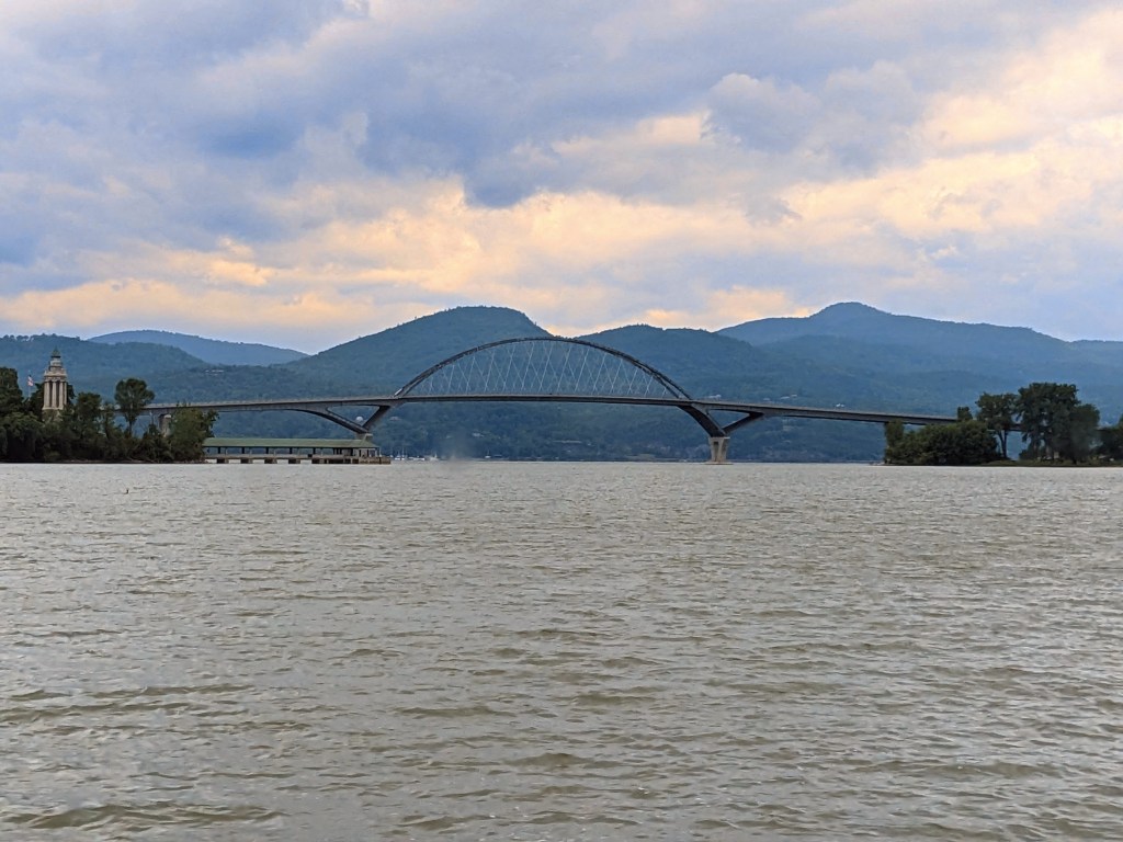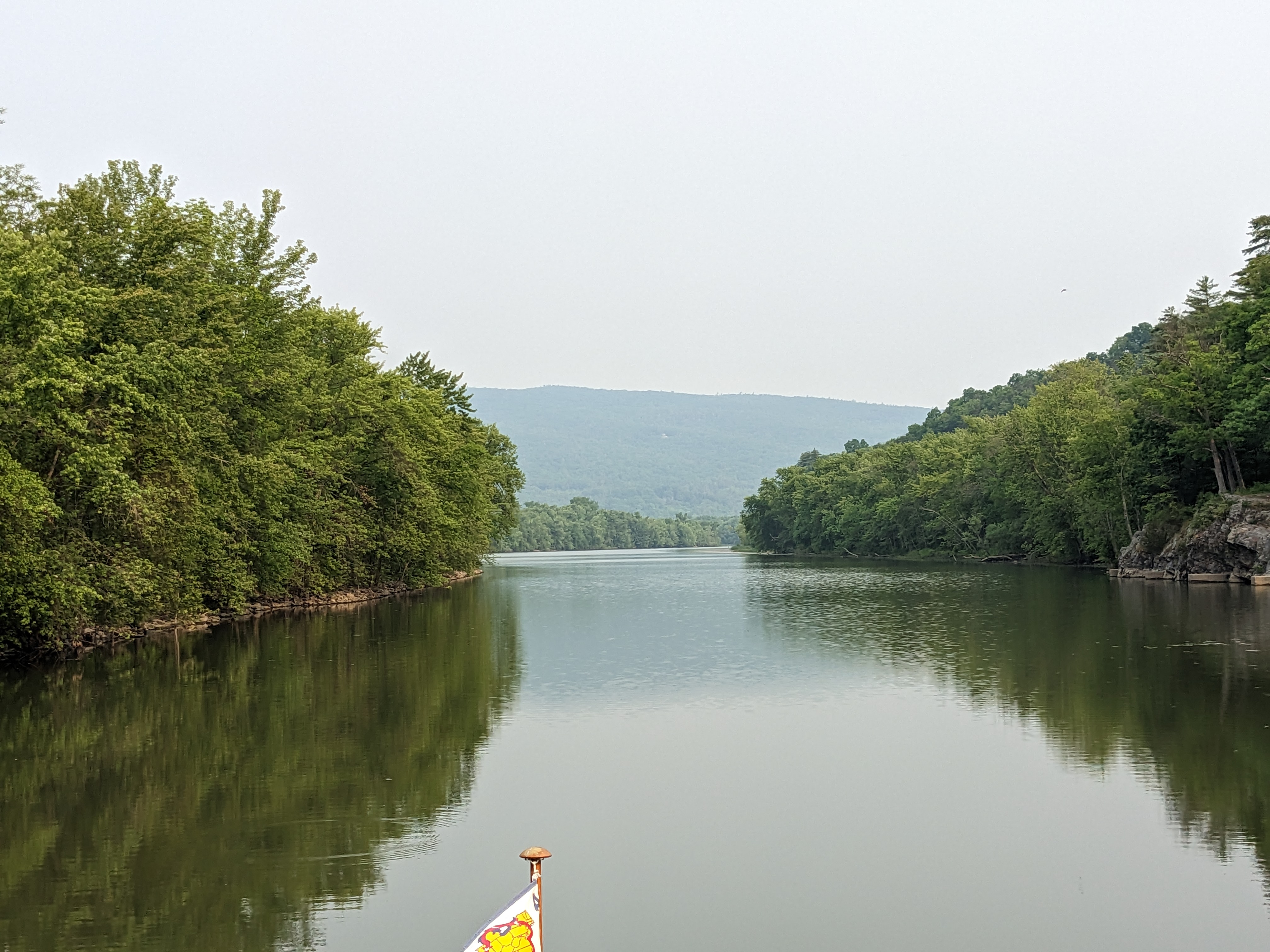 Lake Champlain begins after exiting Lock C12 at Whitehall. Initially it’s like a long narrow river with expansive marshland on both sides filled with singing/calling birds and beaver lodges. Lovely blue/green hills surround the valley. It was a leisurely ride until the clouds came and the wind picked up as the lake widened. Zeke preferred to ride inside where he was warmer… We added a new state to our list when we overnighted at Chipmans Point in Orwell VT at a wonderful family-run marina. Tonight we are in Westport NY where we found a great trail to hike just a few blocks from the marina. This evening it is again chilly enough to run the built-in heater in the main boat salon for short periods. Tomorrow we will travel back across the lake to Burlington VT and stay a few days to explore the city and bike trails.