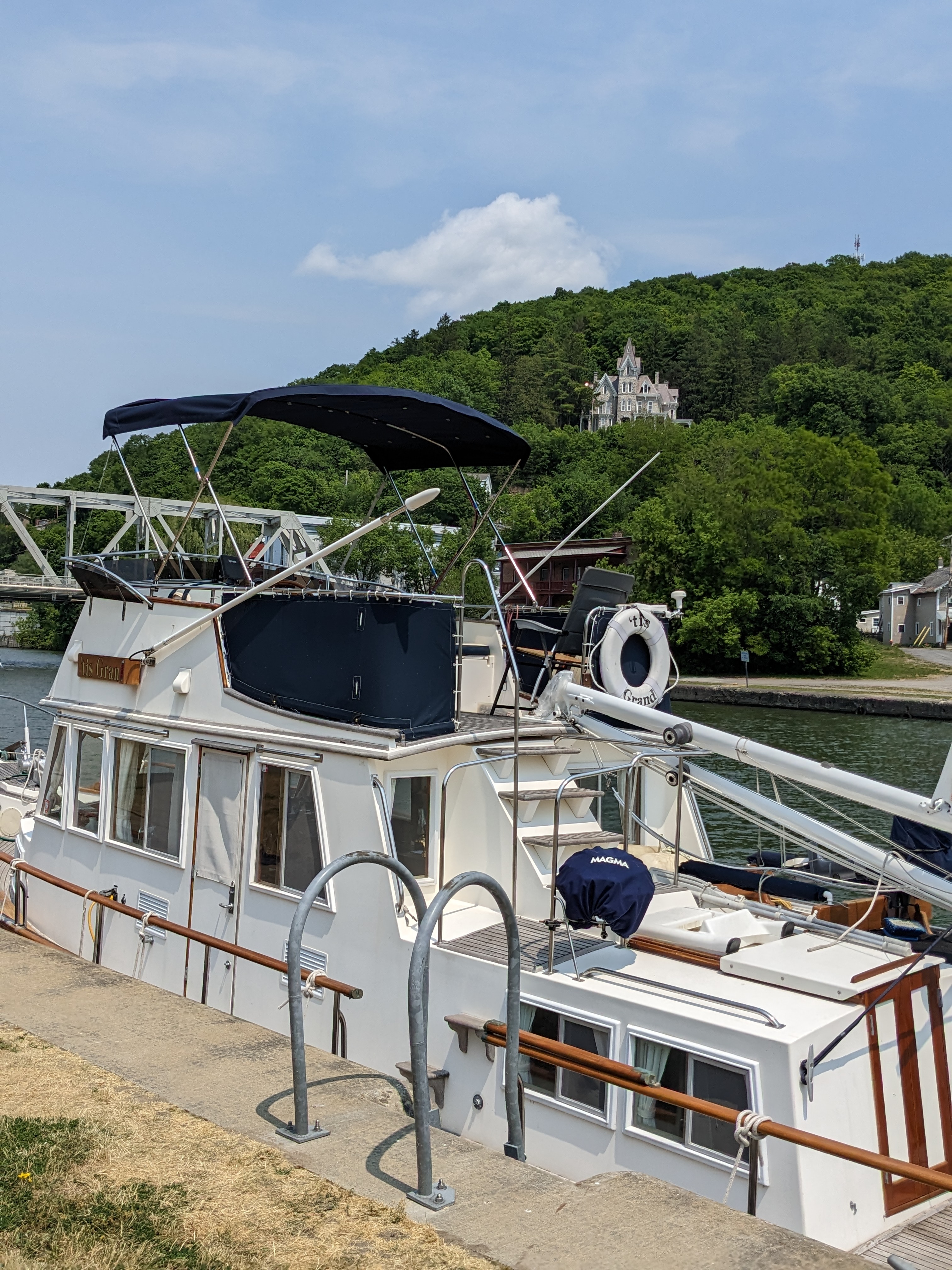 ’tis Grand was “splashed” in Brewerton NY on May 25th after a long winter’s rest in heated storage. We quickly loaded some supplies and groceries, checked out all the systems and took off heading east on the Erie Canal, hoping to reach Shady Harbor Marina on the Hudson within a week’s time, where we would pick up our new bimini. Temps in the high 80s and low 90s without shade cover up top or AC onboard made early starts, noonish docking and finding a shady afternoon respite (like the pub below) necessary.