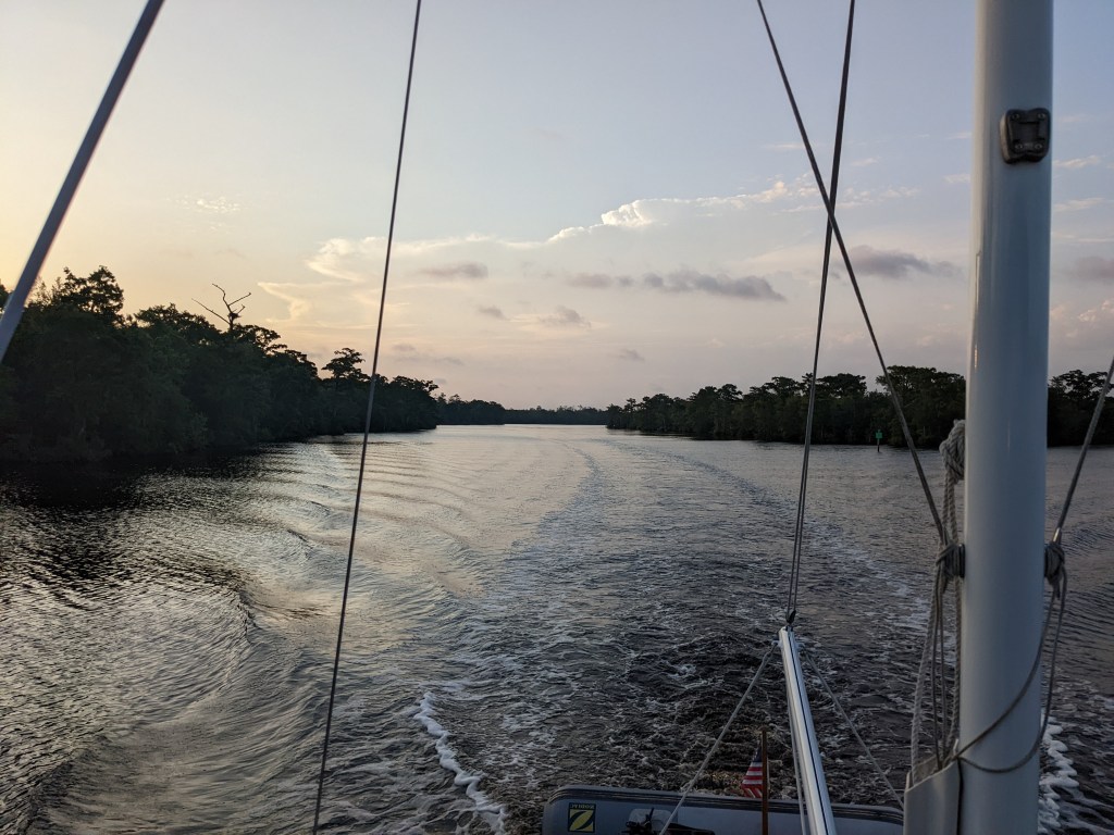 Started at daylight to make 15 miles to South Mills Lock as it only opens 4X daily. We initially hesitated to go through the GDS because of a recent explosion of duckweed, an aquatic plant that can clog the water intake that cools your boat engine and cause engine overheating. But it was a windy day and previous communication with the lock master and GDS staff said it seemed to be thinning and blowing off to the sides. Indeed it was! We traveled through a few long patches, but most of it was hugging the sides. It was a peaceful relaxing day with no other boats around. Stopped for a walk and exhibits at the Visitor Center and made it to the Deep Creek lock at the north end of the Swamp with plenty of time to travel the last 10 miles to the bustling harbor and shipyards in Norfolk/Portsmouth by late afternoon. What a transition!